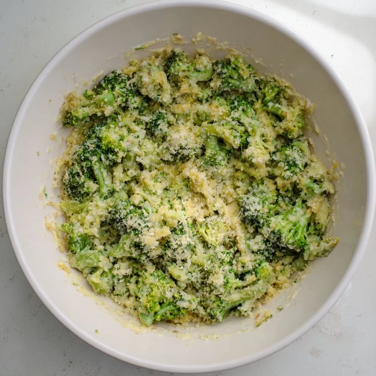 - W dużej misce połącz brokuły, cebulę, cheddar, parmezan i serek kremowy, mieszając do momentu, gdy wszystko się sklei. Poczujesz, jak ser zaczyna się topić od ciepła brokułów – to dobry znak.
