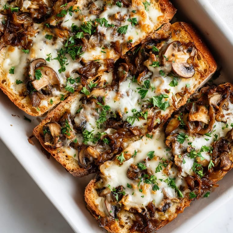 Chrupiące kromki chleba na zakwasie z pyszną mieszanką smażonych pieczarek, aromatycznego czosnku i karmelizowanej cebuli, całość zapieczona pod warstwą roztopionego sera. Danie gotowe w niecałą godzinę, doskonałe zarówno na lunch jak i wieczorną przekąskę. Można wzbogacić świeżymi ziołami oraz ulubionymi sosami. Świetnie sprawdzi się jako sycący obiad dla całej rodziny lub efektowna przekąska dla gości.