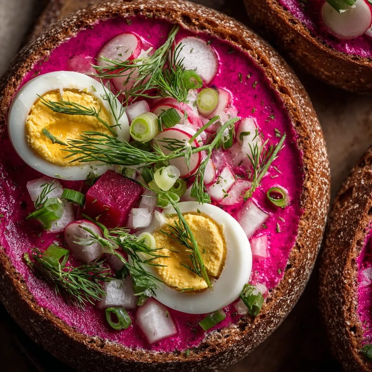 Chłodnik z buraków i ogórka podawany w chlebie żytnim z jajkiem i ziołami.
