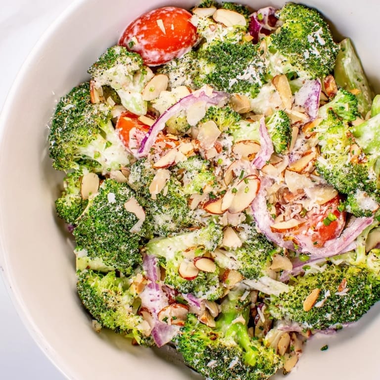 Ta sałatka łączy świeży, blanszowany brokuł z kremowym sosem na bazie czosnku i parmezanu. Dodatek czerwonej cebuli i czerwonych pomidorków wzbogaca smak. Całość posypana prażonymi migdałami lub pestkami słonecznika oraz świeżą natką pietruszki tworzy harmonijną, lekką potrawę. Idealna do podania schłodzona, sprawdza się zarówno jako dodatek, jak i samodzielne danie na lekki obiad.