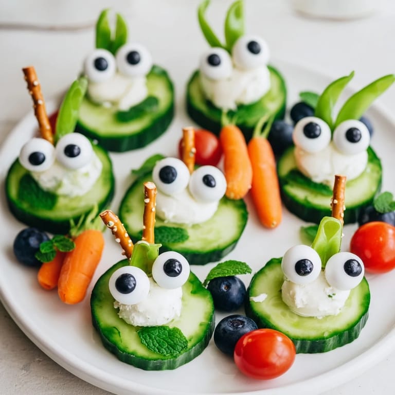 - Połóż kulkę mozzarelli (lub serową) na każdym plasterku ogórka jako ciało żaby.