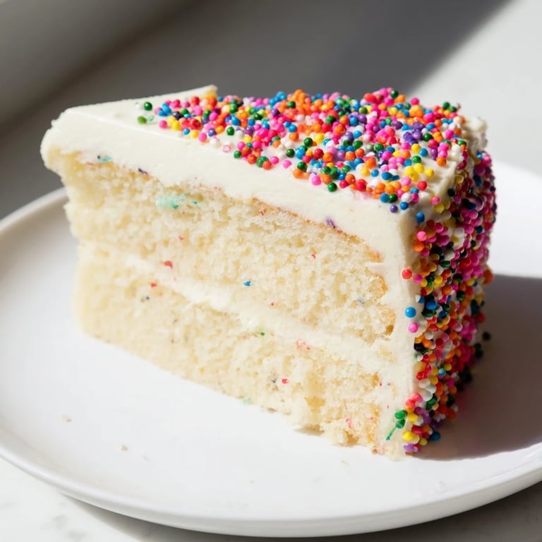Zapisz Świąteczne, wilgotne ciasto waniliowe przekładane kremowym masłem i posypane kolorową posypką — radosna uczta idealna na każdą okazję.