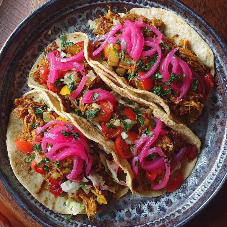 Zapisz Smoky jackfruit bigos w mini żytnich tortillach z chrupiącą kiszoną cebulą to odważne, roślinne połączenie kuchni polskiej i meksykańskiej stworzone na specjalne okazje lub gdy szukasz niebanalnego comfort food. Połączenie intensywnego smaku bigosu z domową tortillą i piklowaną cebulką daje oryginalną alternatywę dla klasycznych tacos i zachwyca nawet tych, którzy na co dzień wybierają mięso.