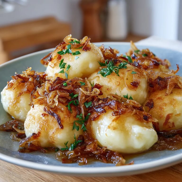 Puszyste kopytka ziemniaczane polane złocistym masłem z karmelizowaną cebulą - domowy komfort w najlepszym wydaniu.