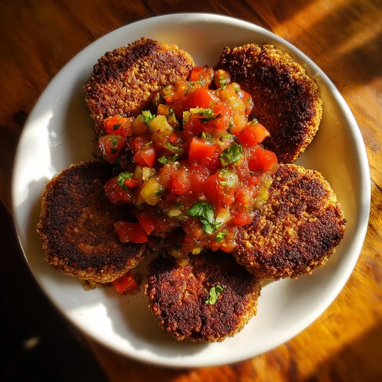 Delikatne kotlety z orzechowej kaszy gryczanej i świeżych warzyw, podawane z aromatycznym relishem pomidorowym.