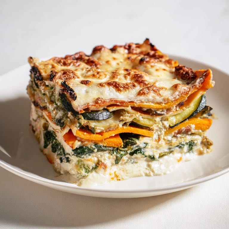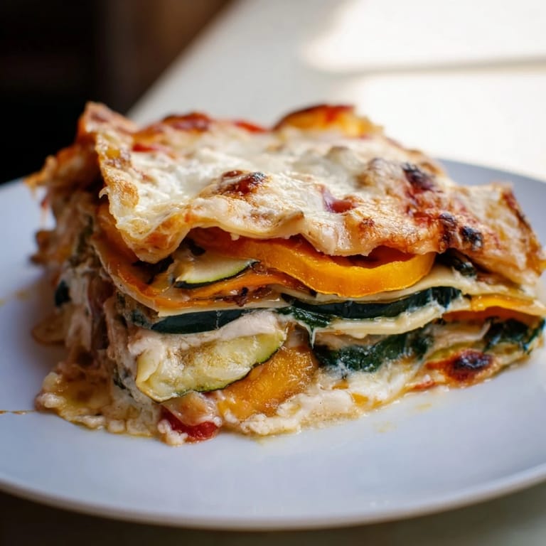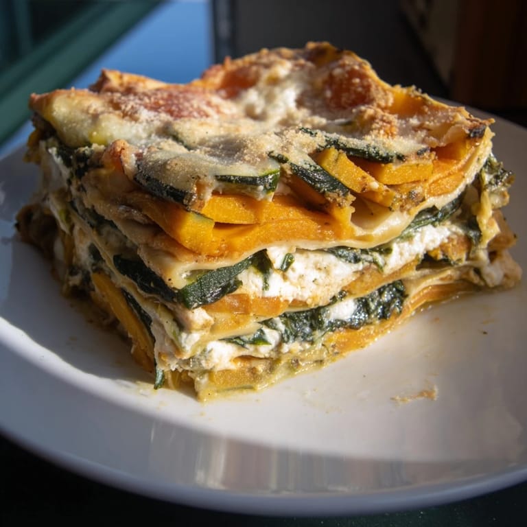 Zapisz Warstwowa lasagne z sezonową dynią, szpinakiem i kremowym ricottą to żywy, sycący obiad, który doskonale wykorzystuje świeże warzywa prosto z ogródka.