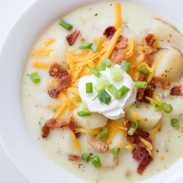 A comforting bowl of Loaded Baked Potato Soup, showcasing hearty potato chunks and crispy bacon. Zapisz