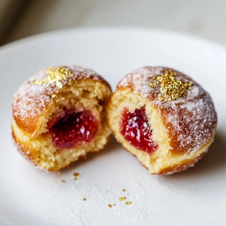 Małe, puszyste pączki z wiśniowym wnętrzem i złotą dekoracją, doskonałe na święta i przyjęcia.