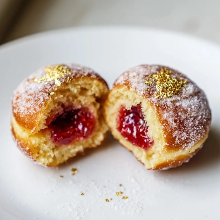 Zapisz Miniaturowe, puszyste pączki z polskim charakterem, napełnione wiśniową konfiturą i pokryte eleganckim złotym listkiem jadalnym — doskonała propozycja na uroczyste okazje.