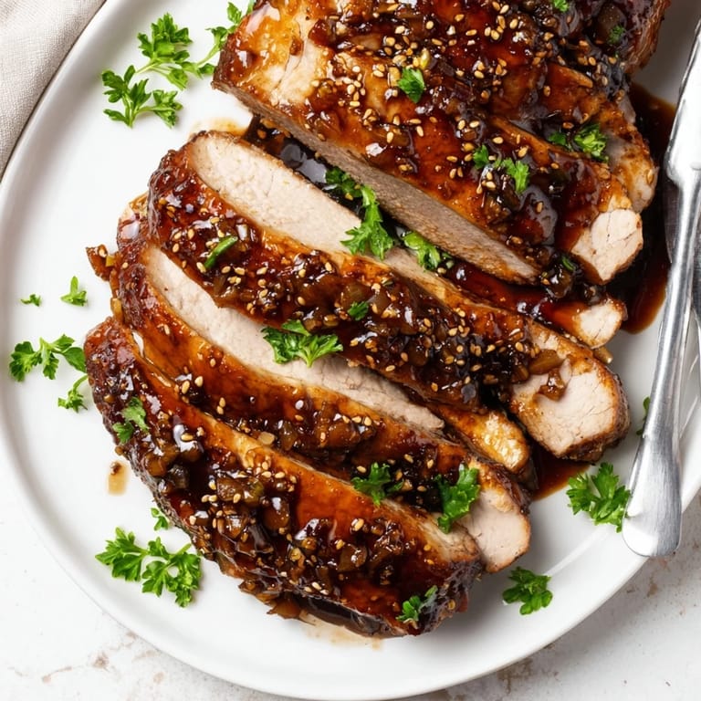 Zapisz Soczysta, delikatna pieczeń wieprzowa z glazurą z miodu i czosnku, idealna na domowy rodzinny obiad lub specjalną okazję.