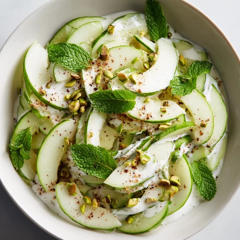 Jesienna mizeria z kefirem jabłkiem i pistacjami to kolorowa i odświeżająca odsłona klasycznej polskiej sałatki której lekka słodycz jabłka i chrupkość pistacji wywołują uśmiech nawet podczas najbardziej pochmurnych dni. Idealna do obiadu lub jako szybka przekąska gdy chce się czegoś prostego lecz efektownego i naprawdę pełnego smaku.