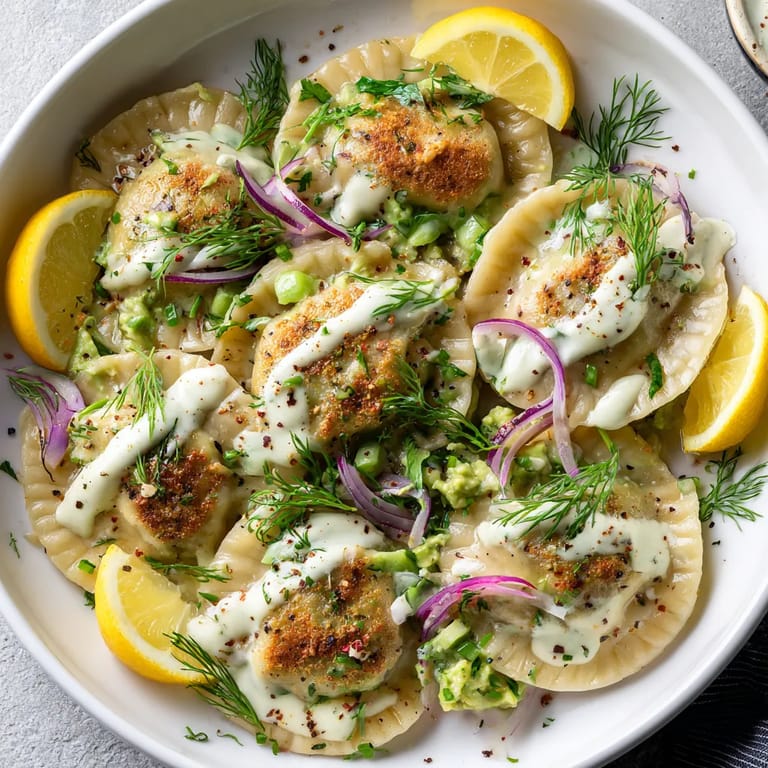 Podawanie: Ułóż pierogi na talerzach, polej sosem jogurtowym z cytryną, udekoruj świeżym koprem i podawaj z ćwiartkami cytryny.