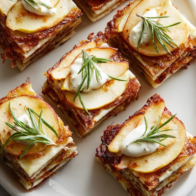 Zapisz Warstwowe placki ziemniaczane z jabłkami karmelizowanymi i kremem rozmarynowym to jesienna wariacja, która łączy w sobie słodkość owoców i aromat świeżego rozmarynu z tradycyjnym smakiem placków ziemniaczanych. Ten deser wytrawny zachwyca nie tylko smakiem, ale także efektowną prezentacją – warstwowe stosiki wyglądają niesamowicie podczas serwowania i zawsze robią wrażenie na gościach.