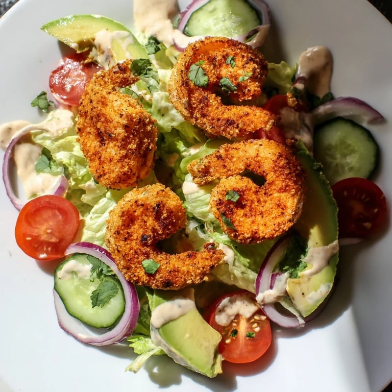- Ułóż chrupkie krewetki na wierzchu, polej sosem sriracha-limonkowym i posób świeżą kolendrą. Służą natychmiast, zanim cokolwiek robi się miękkie.