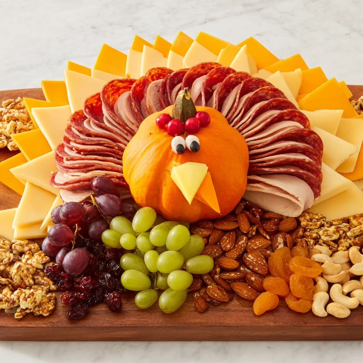 Zapisz Wheat Field Thanksgiving Turkey Board to świąteczna i estetyczna deska wędlin, która wygląda jak pole pszenicy i indyk, zawierająca różnorodne sery artystyczne, peklowane mięsa, krakersy, świeże owoce i orzechy – idealna na święto Dziękczynienia.