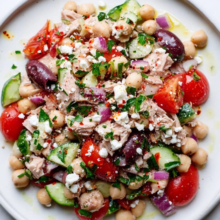 Białko z ciecierzycy i tuńczyka robi to posiłkiem, a nie tylko przystawką, więc możesz je zjeść na obiad bez zastanowienia się, czy powinieneś dodać coś jeszcze. Warzywa dostarczają koloru, skrzypu i witamin, a kwaskowy dressing wszystko wiąże razem tak, że każdy kęs smakuje tak samo dobry jak pierwszy.