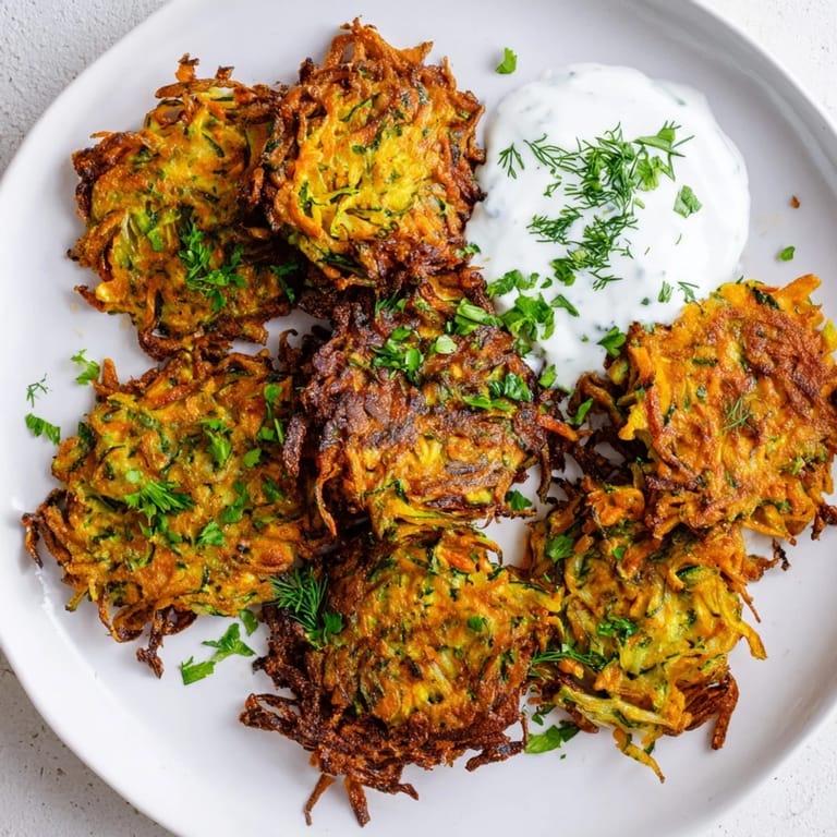 Zapisz Chrupiące placuszki z cukinii i marchewki podawane z orzeźwiającym sosem jogurtowo-czosnkowym to idealna przekąska, przystawka lub lekki posiłek na cieplejsze dni.