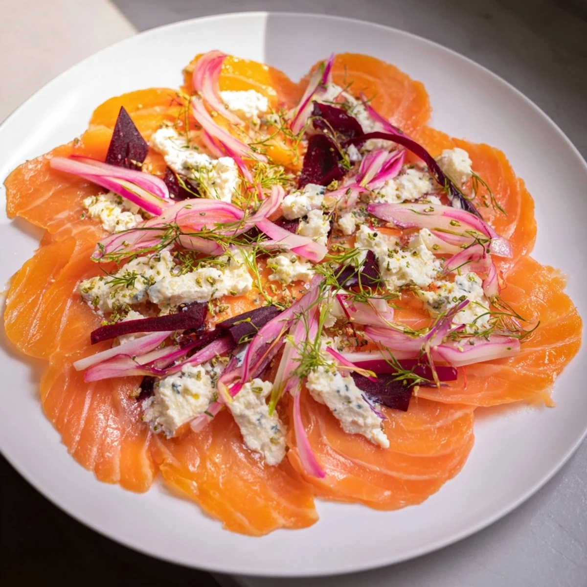 - Równo rozłóż plasterki buraka, kopru włoskiego, rzodkiewek, roszponki oraz marynowanej czerwonej cebuli wokół łososia.