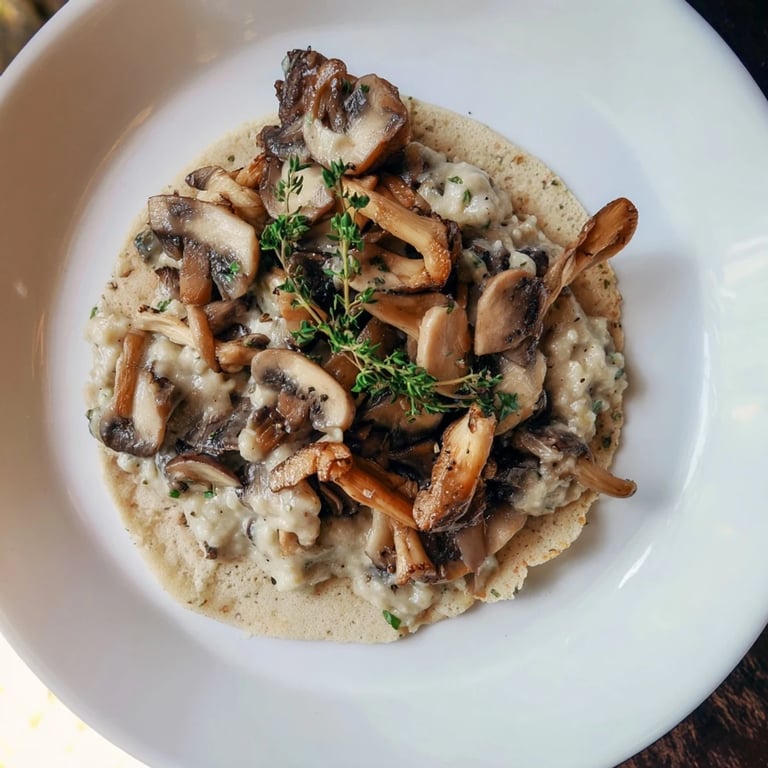 Zapisz Aromatyczny i elegancki gulasz z mieszanych grzybów duszonych w bogatym, wytrawnym sosie, serwowany na delikatnych, orzechowych blinach gryczanych. Idealny na przytulny zimowy posiłek lub uroczyste spotkanie.